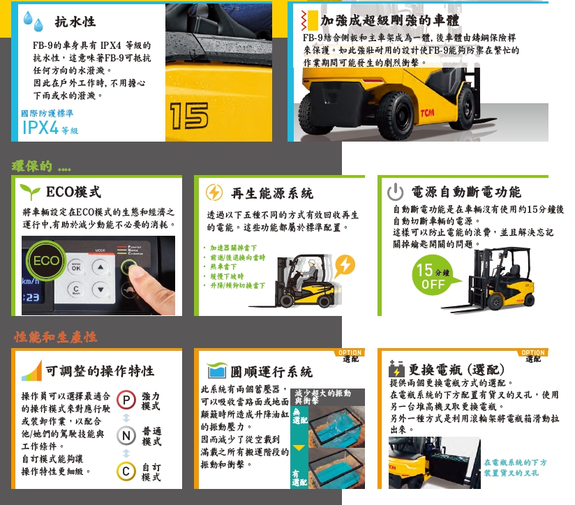 系列電動堆高機具有剛強和防水的車體,在所有物流搬運的場景中展現出其最佳的性能