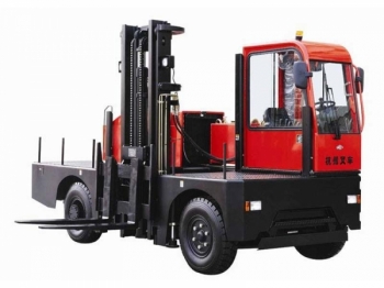 它與一般平衡重式正面堆高機的主要區別在於側叉的工作裝置安裝在車身側面,除可以升降、傾斜外,還可以沿車身側向伸出和收進。適用於長型貨物的裝卸、堆垛和運輸。運輸時,貨物縱向放置在貨台上,對通道寬度的要求較小,能充分有效地利用場地面積。因此廣泛適用於石油化工、冶金、交通運輸、建築等行業中,裝卸、搬運長形重物(如:鋼管、型鋼、電線桿、集裝箱等)尤為適用,可大大提高工作效率。
